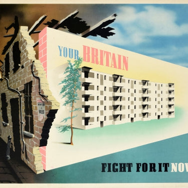 Original vintage World War Two poster - Your Britain Fight For It Now - featuring a great design by the notable British graphic designer Abram Games (Abraham Gamse; 1914-1996) depicting a dark illustration of a bombed out street in ruins with a damaged light and windows on the walls, a cobblestone road and an old ripped health poster advertising - Carbol disinfectant kills fleas bus midges rats - at the end of the ruined brickwork with a bright image behind showing the future housing accommodation of a new modern block of flats next to a tree against a blue sky background, the title text above and below, and information on the side - Clean, airy and well planned dwellings make a great contribution to the Rehousing movement. This is a fine example of a block of workers' flats built in London in 1936. Issued by A.B.C.A. Army Bureau of Current Affairs formed in 1941 to promote education and training during WWII and the post-war reconstruction period. Printed in England by Multi Machine Plates Ltd London. Horizontal. Good condition, restored tears on edges, restored pinholes, restored folds, minor staining, backed on linen.