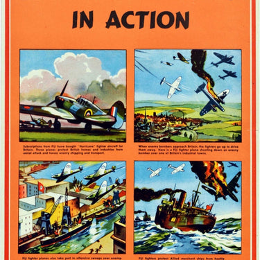 Original vintage World War Two poster - Your Hurricanes In Action Thank You Fiji! - featuring four colourful captioned illustrations depicting Hurricane fighter jets marked with Royal Air Force RAF roundels gifted by Fiji on the ground; showing the planes defending a British industrial town by shooting down an enemy bomber plane; and flying over Nazi Germany to attack the enemy-occupied territory with machine gun fire, in particular shipping, communications and factory targets; and protecting allied merchant ships at sea to ensure vital cargo reaches British ports - thanks to the war gifts from Fiji. The logo and more information on their other donations are given below that include Typhoon and Whirlwind aircraft and motor ambulances, Red Cross and St John Fund, Aid to Russia, St Dunstan's, Dr Bernando's Homes for Children, Malta Air Raid Relief Fund and other contributions. Good condition, light fold, tears on edges, minor creasing.