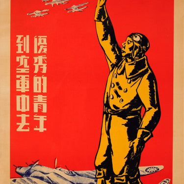 Original vintage World War Two propaganda poster promoting the Chinese Air Force - Outstanding Youths, Join the Air Force! Printed by the Board of Political Training, Military Affairs Commission. The design features a great illustration of a Chinese pilot in aviation goggles and uniform holding his arm up in front of a bold red background with a military plane on the runway behind him and three planes flying above, the text on the side. Good condition, restored paper losses, restored creases, backed on linen.