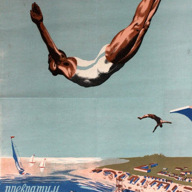 Original vintage Soviet sport poster: Youth of Leningrad! Transform our water and rowing stations into enclaves of mass sport! Great image from the viewpoint of a high diver diving towards the sea below next to another diver with sailing and rowing boats, a kayak and swimmers by a beach. Very good condition, light folds.