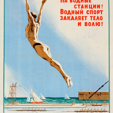 Original vintage Soviet sport propaganda poster: Youth! To water stations! Water sports toughen the body and the will! (Молодежь! На водные станции! Водный спорт закаляет тело и волю!). Dynamic illustration featuring a healthy young man diving up in the foreground with other athletes rowing and sailing at sea and diving into a pool area in the background, the stylised lettering in red above. Very good condition, restored folds, backed on linen.