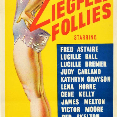 Original vintage movie poster for an MGM film in Technicolour - Ziegfeld Follies - the Greatest production since the birth of motion pictures! featuring an all star cast including Fred Astaire, Judy Garland, Lucille Ball, Lucille Bremer, Gene Kelly and others, directed by Roy Del Ruth and Vincente Minnelli, and produced by Arthur Freed. Fun pin-up style design depicting a lady in a feather bird costume smiling at the viewer while holding a telephone with her other hand on her hip, the bold stylised title letter Z following the shape of her body with the text on the side against the yellow background. This musical film was a cinematic take on The Ziegfeld Follies theatrical production on Broadway New York City that ran from 1907 to 1931, inspired by the pretty pin up chorus girls and dancers of the Folies Bergere Paris and conceived by Florenz Ziegfeld (1867-1932). Printed by Simmons Limited, Sydney. Good condition, folds, creasing, small tears, minor staining.