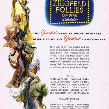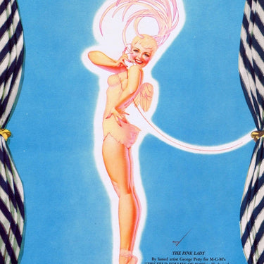Original trade card for a US musical film Ziegfeld Follies of 1946, featuring an all star cast: Fred Astaire, Judy Garland, Lucille Ball, Lucille Bremer, Gene Kelly and others. Directed by Roy Del Ruth and Vincente Minnelli, produced by Arthur Freed. In Technicolor. Fantastic image of The Pink Lady designed by American pin-up artist, George Brown Petty IV (1894-1975), who produced images of pin-up girls for Esquire and his artwork of what became known as "Petty Girls" was popular as nose art decoration on warplanes during World War Two, including the Memphis Belle. The movie was a cinematic take on The Ziegfeld Follies theatrical production on Broadway, New York City, that ran from 1907 to 1931 and was inspired by the Folies Bergere of Paris, conceived by Florenz Ziegfeld. Excellent condition, printed on both sides.