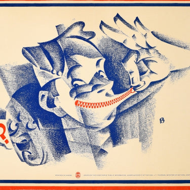 Original vintage World War Two propaganda poster warning against talking too much and sharing military secrets to the enemy who might be listening, depicting a great design in shades of blue of a soldier zipping his mouth with a red zip as Hitler looks from behind with a red question mark. Issued by the Director of Public Information under the authority of the Hon. J.T. Thorson Minister of National War Services Ottawa. Horizontal. Fair condition, restored tears, restored paper losses, restored folds, trimmed edge, backed on linen.