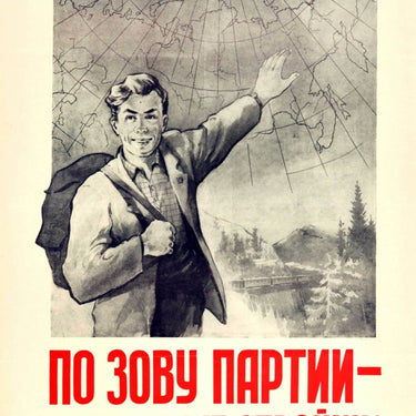 Original vintage Soviet propaganda poster - По зову партии на ударные стройки! Answer the Communist Party Call to New Industrial Construction Sites! - featuring a smiling man carrying a bag over his shoulder and looking to the viewer while pointing towards a map in the background above a scenic view of a train passing trees and hills in the countryside, the bold text in red lettering below. Good condition, folds, tears, creasing, minor staining.