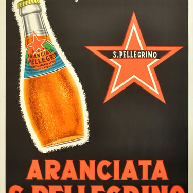 [ON RESERVE] Large original vintage advertising poster for a popular and iconic drink, Aranciata S. Pellegrino. The joy of being thirsty! - La gioia di aver sete! Bold and colourful image on a black background of a bottle of drink with a bright logo and text. Aranciata was invented in 1932 by Ezio Granelli, owner of the San Pellegrino spa, who decided to offer the drinks to guests at a trade fair in Milan. The company is now owned by Nestle. Very good condition, repaired folds.