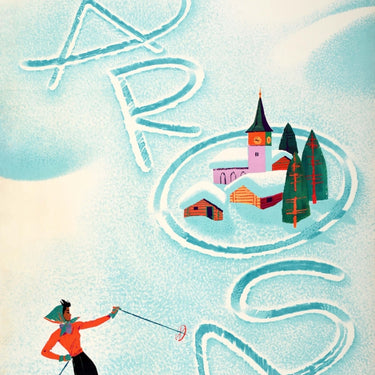 Original vintage winter travel poster for Arosa Schweiz Suisse Switzerland featuring a fun and colourful design by the notable Swiss artist Donald Brun (1909-1999) depicting a fashionably dressed skier wearing a green headscarf and red top at the bottom of a snow covered slope, turning around and pointing to the tracks she left behind with a ski pole, spelling out the word Arosa from the mountain peaks with the O circling the trees and clock tower in the town, a bright stylised sun against the blue sky above. The resort town of Arosa is located in the Canton of Graubunden in the St Moritz region, popular for skiing and other winter sports as well as hiking and other summer sport activities. Printed in Switzerland by Frobenius S.A Basel. Good condition, restored tears on edges, minor staining, backed on linen.