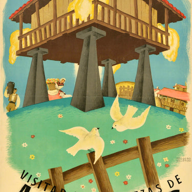 Original vintage Spain travel poster - Visit the Beauties of Asturias / Visitad Las Bellezas De Asturias - featuring scenic countryside artwork by Teodoro Delgado Ramos (1907-1975) depicting a traditional horreo granary building on pillars with farm buildings, a man carrying a jug on his shoulder and a lady carrying a basket next to a sheep in the background, and two white doves flying above a fence and flowers on the grass in the foreground, the curved title text below. Printed by Afrodisio Aguado Madrid. Good condition, restored folds, restored tears, staining, pencil marks, backed on linen.