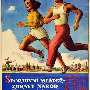 Original vintage sports propaganda poster - Athletic Youth a healthy nation, a happy life at work and peace / Sportovni mladez zdravy narod, stastny zivot v praci a miru - featuring a smiling boy and girl running in the foreground with people playing volleyball in the background and a swimmer diving into a pool off a high dive board in front of spectators and flags flying in the distance, the bold red and white text with the PPOV - I logo on a blue banner below. Good condition, folds, creasing.