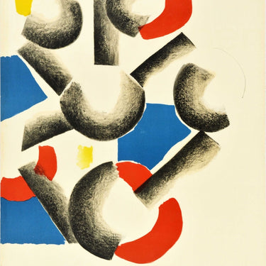 [ON RESERVE] Original vintage poster featuring a colourful abstract design by the Dutch graphic designer Jan Bons (1918-2012) featuring atom shapes in shades of black in front of a red, blue and yellow background resembling the Atomium building in Brussels (built in 1958). Large size. Good condition, creasing, tears, staining.
