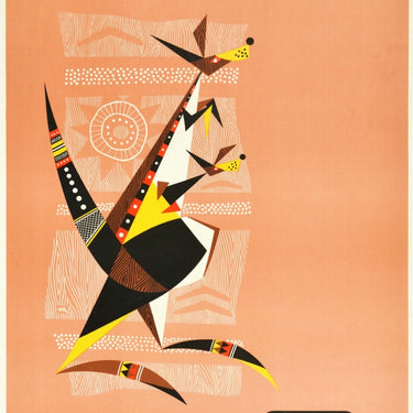 Original vintage travel poster for Australia by Qantas Australia's Overseas Airline in association with BOAC (British Overseas Airways Corporation) and TEAL (Tasman Empire Airways Limited) featuring a colourful aboriginal art style design by Harry Rogers (1929-2012) of a kangaroo carrying a baby roo in its pouch with a stylised plane flying through the title above and rest of the text below. Excellent condition, backed on linen.