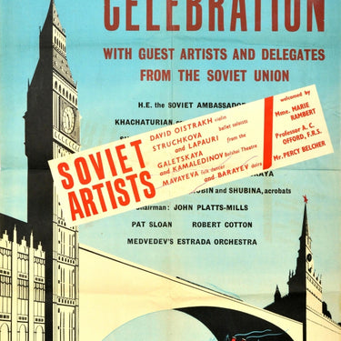 Original vintage advertising poster - Month of British Soviet friendship November 1954 37th Anniversary of the USSR Celebration with guest artists and delegates from the Soviet Union Empress Hall Earls Court - featuring an image of Big Ben connected by a bridge to the Moscow Kremlin. Good condition, creasing, folds, tears, minor staining.
