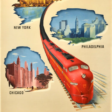 Original vintage travel poster advertising the Broadway Limited (1912-1995) passenger train services operated by the Pennsylvania Railroad PRR (Pennsy; founded 1846) featuring an image of a streamlined train passing scenic images of the New York City skyscrapers on a railway line via a view of Philadelphia to the city buildings of Chicago with the title text in bold stylised lettering below - Broadway Limited all private room luxury streamliner Pennsylvania Railroad. Good condition, creasing, tears, minor staining.