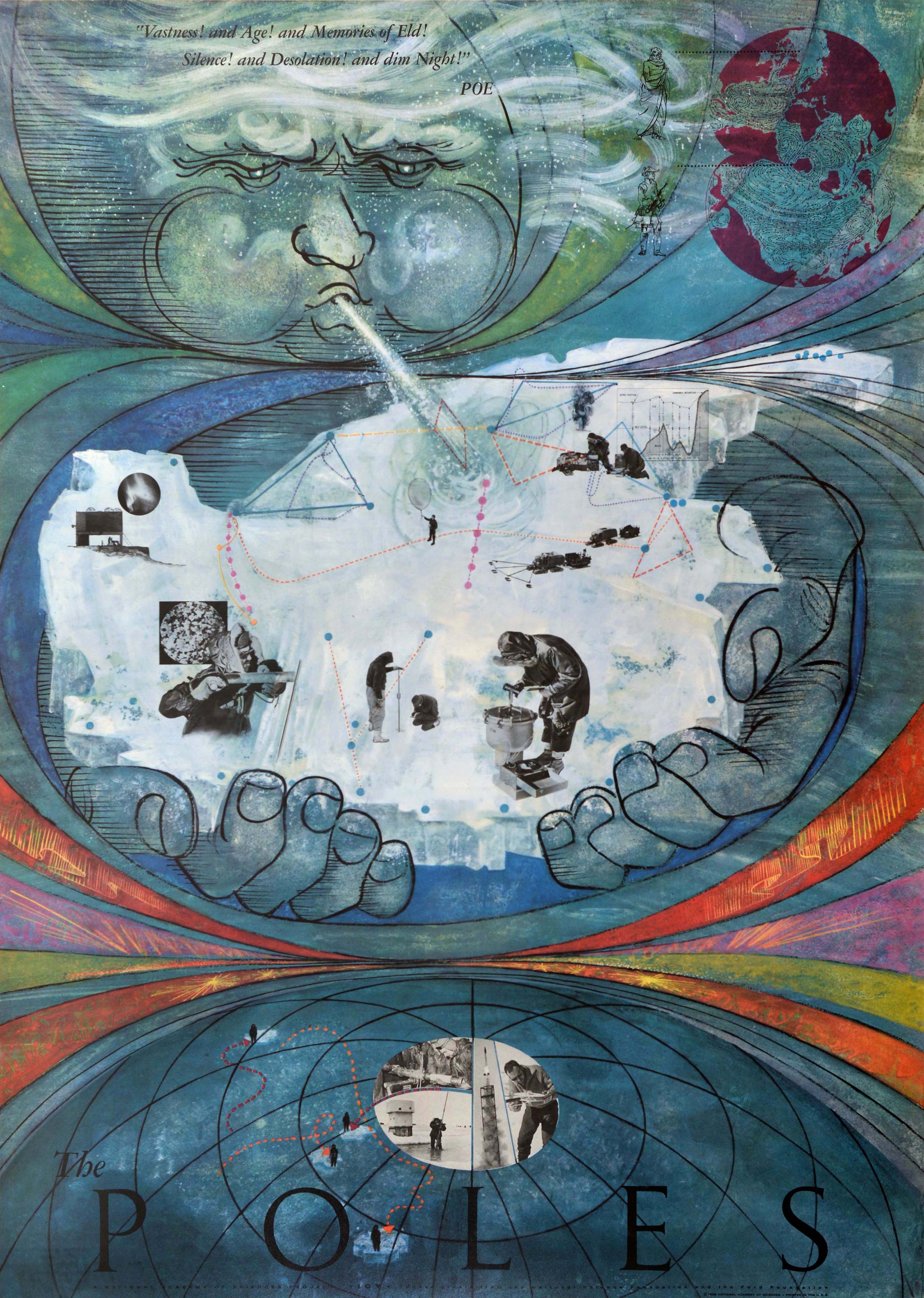Original vintage National Academy of Sciences (NAS) poster - Poles "Vastness! and Age! and Memories of Eld! Silence! and Desolation! and dim Night!" Poe - from a series of six posters created in 1958 by artist Herbert Danska, depicting a face resembling the Greek god of the winds Aeolus blowing wind onto the South Pole held by a pair of outline hands with small inset photographs showing scientists working on the ice in Antarctica with scientific graphs, the quote next an image of earth above and the bold title text in front of a globe below. The American nonprofit, non-governmental organization National Academy of Sciences was formed in 1863. A National Academy of Sciences Project IGY Under grants from the National Science Foundation and The Ford Foundation. Large size. Good condition, creasing, tears on edges.