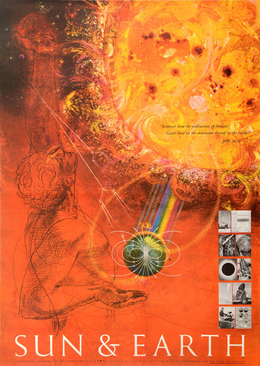 Original vintage National Academy of Sciences (NAS) poster - Sun & Earth "Knowest thou the ordinances of heaven? Canst thou set the dominion thereof in the earth?" Job 38:33 - from a series of six posters created in 1958 by artist Herbert Danska, depicting a silhouette facing the sun in blazing red and orange, reaching one arm up with his other hand below a spherical object as a globe behind white lines and arrows with a lightening bolt, aurora on the north and south poles and a spacecraft on the side, the small black and white inset photographs below the quote showing scientists at work, graphs and scientific equipment above the bold title text at the bottom. The American nonprofit, non-governmental organization National Academy of Sciences was formed in 1863. A National Academy of Sciences Project IGY Under grants from the National Science Foundation and The Ford Foundation. Large size. Very good condition, creasing.