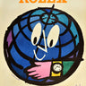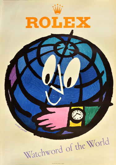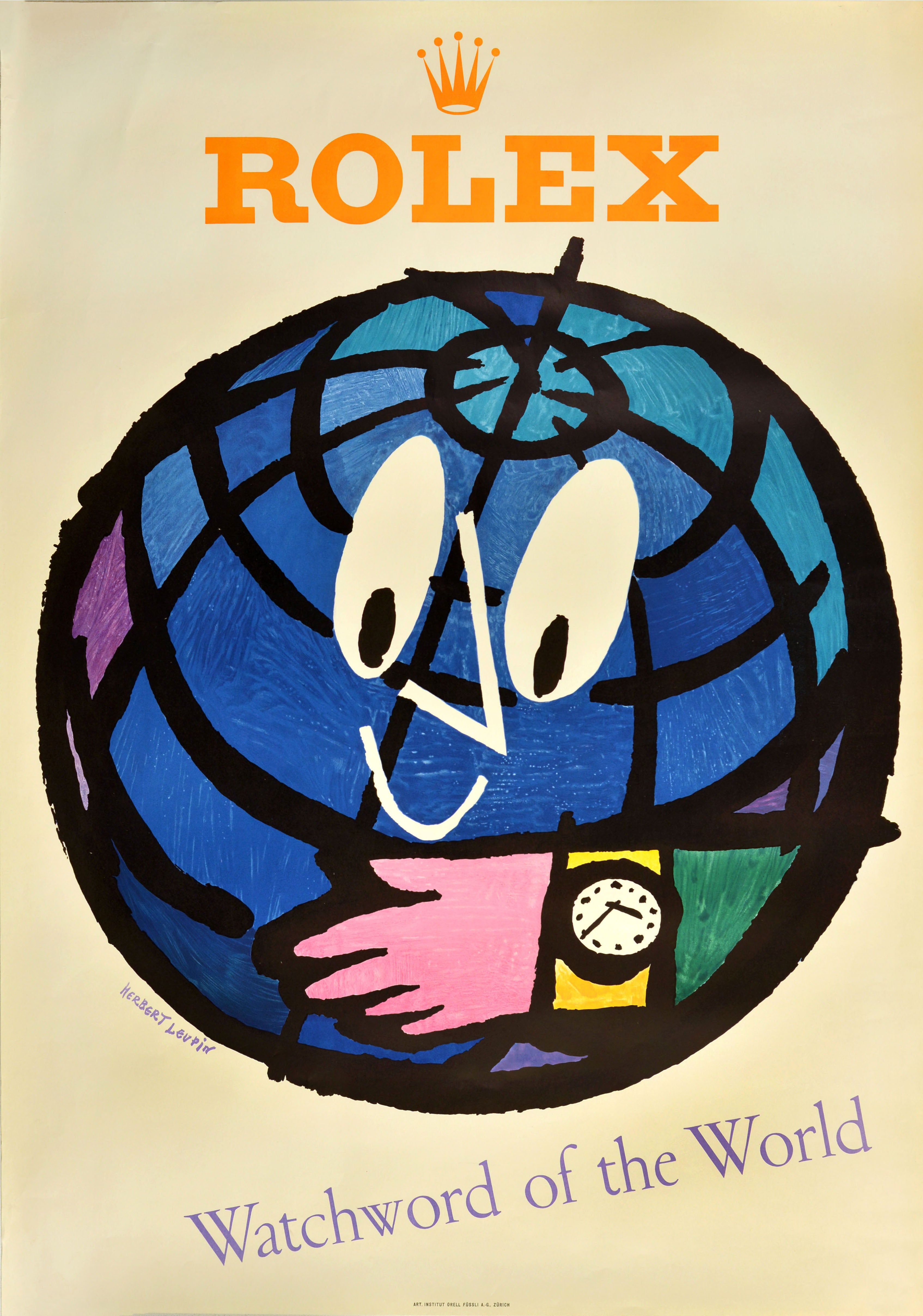 Original vintage watch advertising poster for Rolex Watchword of the World featuring a colourful and fun image by the notable Swiss poster designer Herbert Leupin (1916-1999), depicting a smiling face on a globe looking down at his watch, the Rolex name and crown logo ("crown of achievement") above and slogan diagonally below. One of the world's largest luxury watch brands, Rolex was founded in 1905. Printed by Art Institut Orell Fussli, Zurich. Large size. Very good condition, minor creasing, small tears on edges.