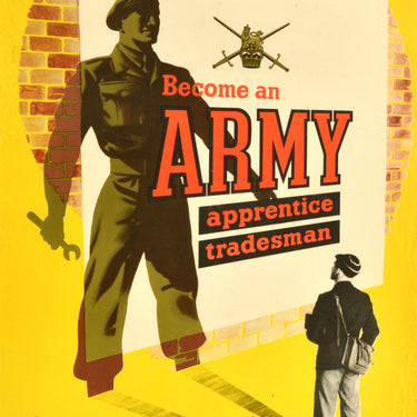 Original vintage British Army recruitment poster featuring a great design depicting a young boy in school uniform and cap with a satchel over his shoulder looking up at a large poster on a brick wall with a crossed swords and lion and crown insignia on it - Become an Army Apprentice Tradesman - with his shadow forming an image of a military engineer in uniform and holding a spanner to represent his future, set on a yellow background with the rest of the text below - Start young to learn a job 15-17 For information apply to the nearest Army Information Office or direct to the War Office (MPs) London SW1. Prepared for the War Office by the Central Office of Information. Printed by Fosh and Cross Ltd, London. Fair condition, folds, creasing, tears, minor staining, paper losses.