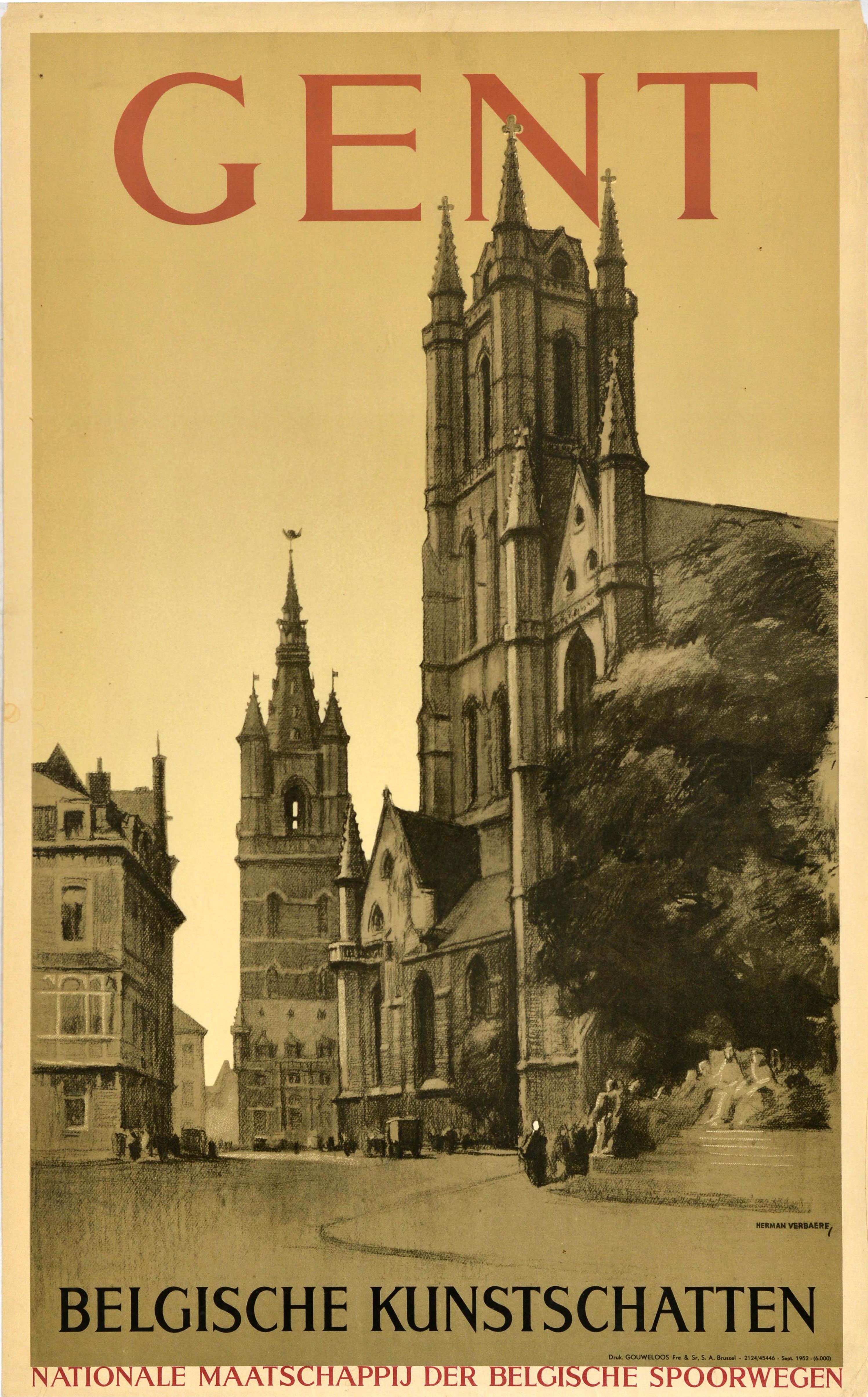 Original vintage train travel poster - Ghent Belgian Art Treasures / Gent Belgische Kunstschatten - featuring a great design by Herman Verbaere (1905-1993) depicting a view of people walking along the street outside the historic Gothic Saint Bavo's Cathedral / Sint-Baafskathedraal (home of the altar masterpiece by Jan and Hubert van Eyck) with a tree on the side and the medieval Belfry of Ghent / Belfort van Gent in the background, the bold title text above and below. Published by National Belgian Railway Company / Nationale Maatschappij der Belgische Spoorwegen. Printed by Gouweloos Fre & Sr, Brussels. Good condition, creasing, tears, paper losses, staining.