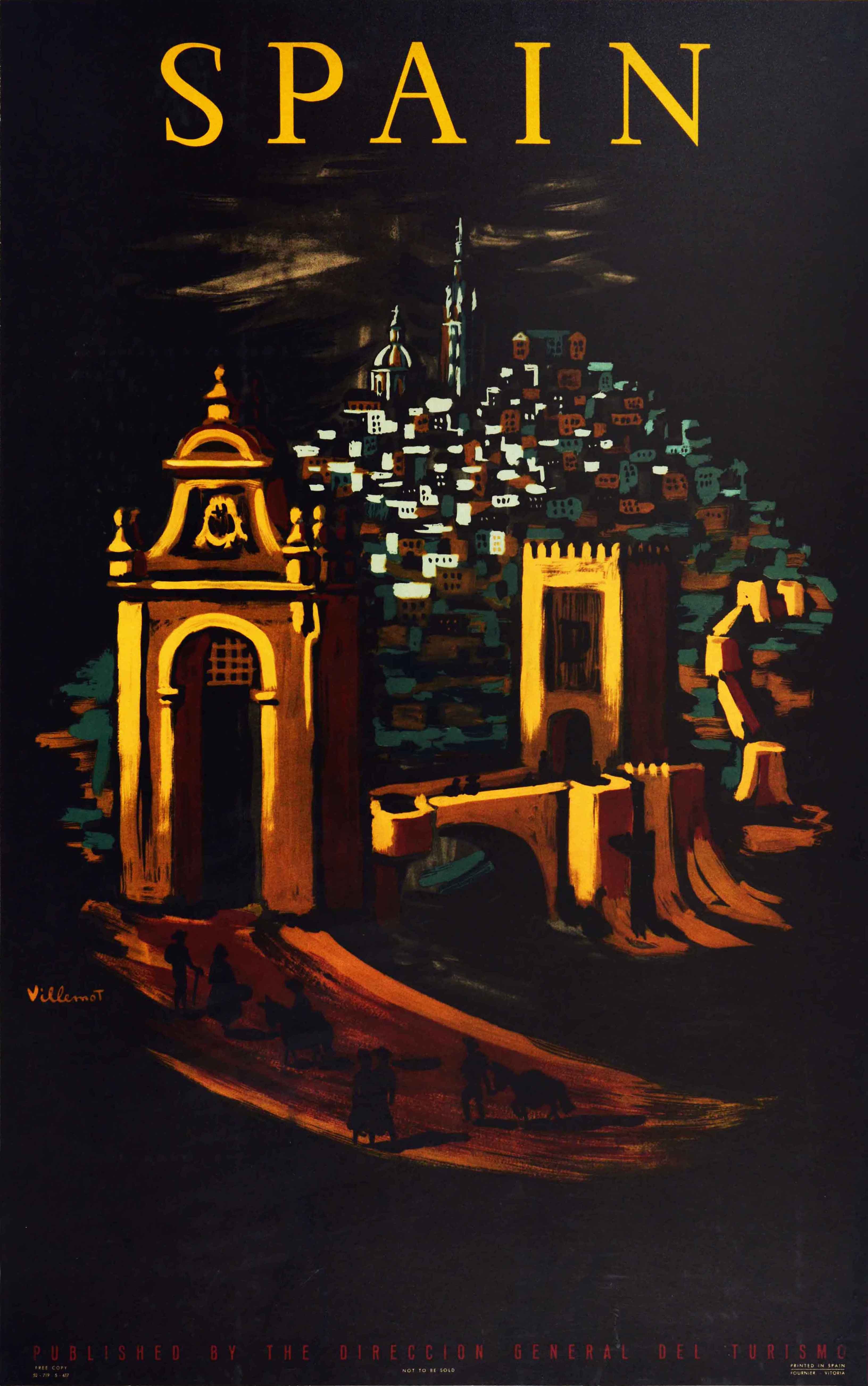 Original vintage travel poster for Spain featuring great artwork by the notable French graphic artist Bernard Villemot (1911-1989) depicting a Spanish town at night with historic church towers and buildings, and silhouettes of people with donkeys heading to the walled city gate set over a dark background. Published by the Direccion General del Turismo / Directorate General of Tourism. Printed by Fournier Vitoria. Good condition, restored tears, restored creasing, restored folds, restored paper losses, backed on linen.