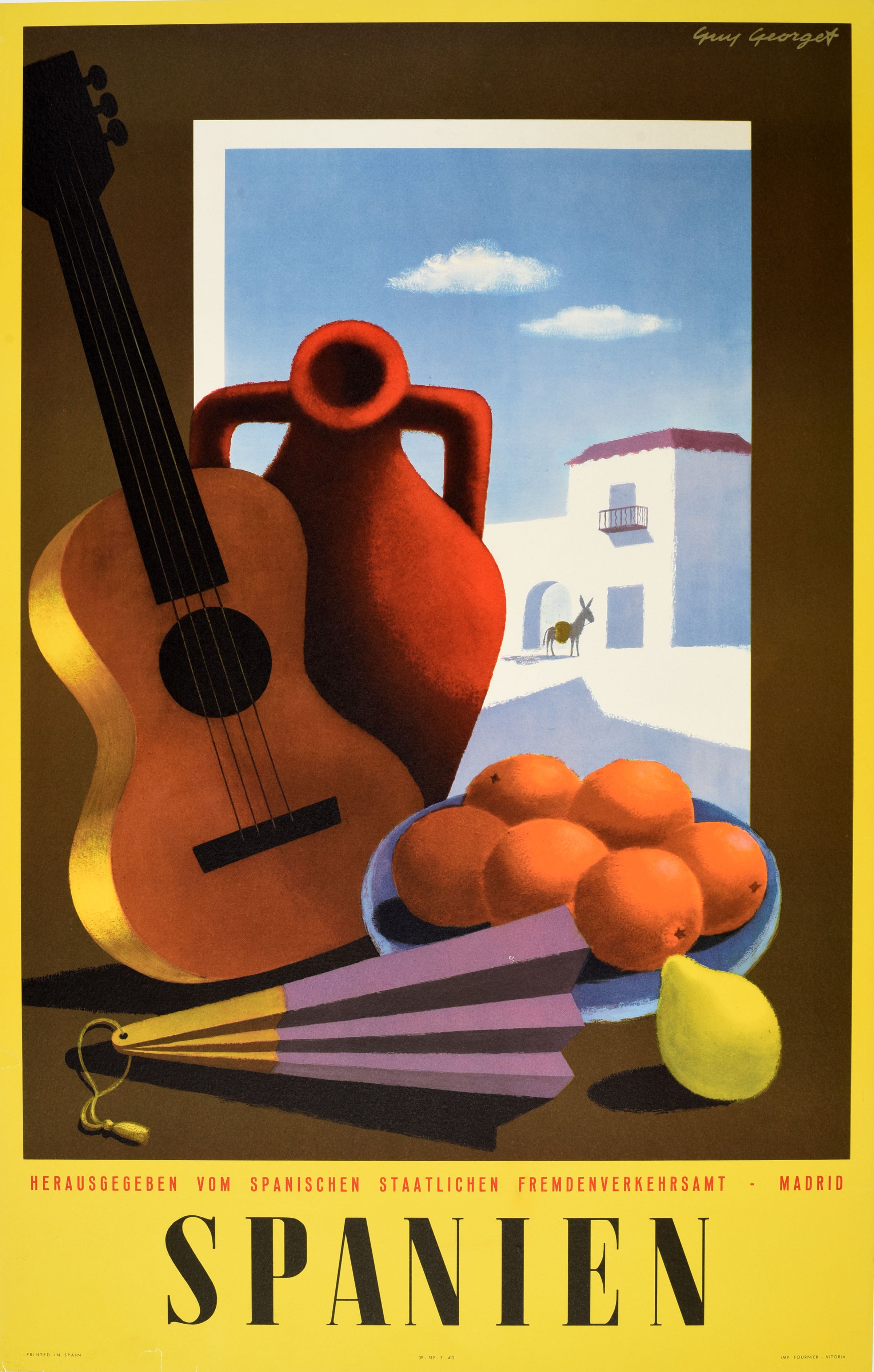 Original vintage travel poster for Spain / Spanien issued by the Spanish State Tourist Office featuring a colourful still life design by Guy Georget (1911-1992) depicting a fan and pot, oranges on a plate, a lemon and a guitar against the wall with a view through the window of a donkey in front of a white building in the sunshine below the blue sky background, the bold text in German on the yellow margin below. Printed in Spain by Fournier Vitoria. Good condition, restored paper loss on left margin, restored tears on edges, minor staining, backed on linen.