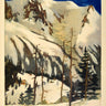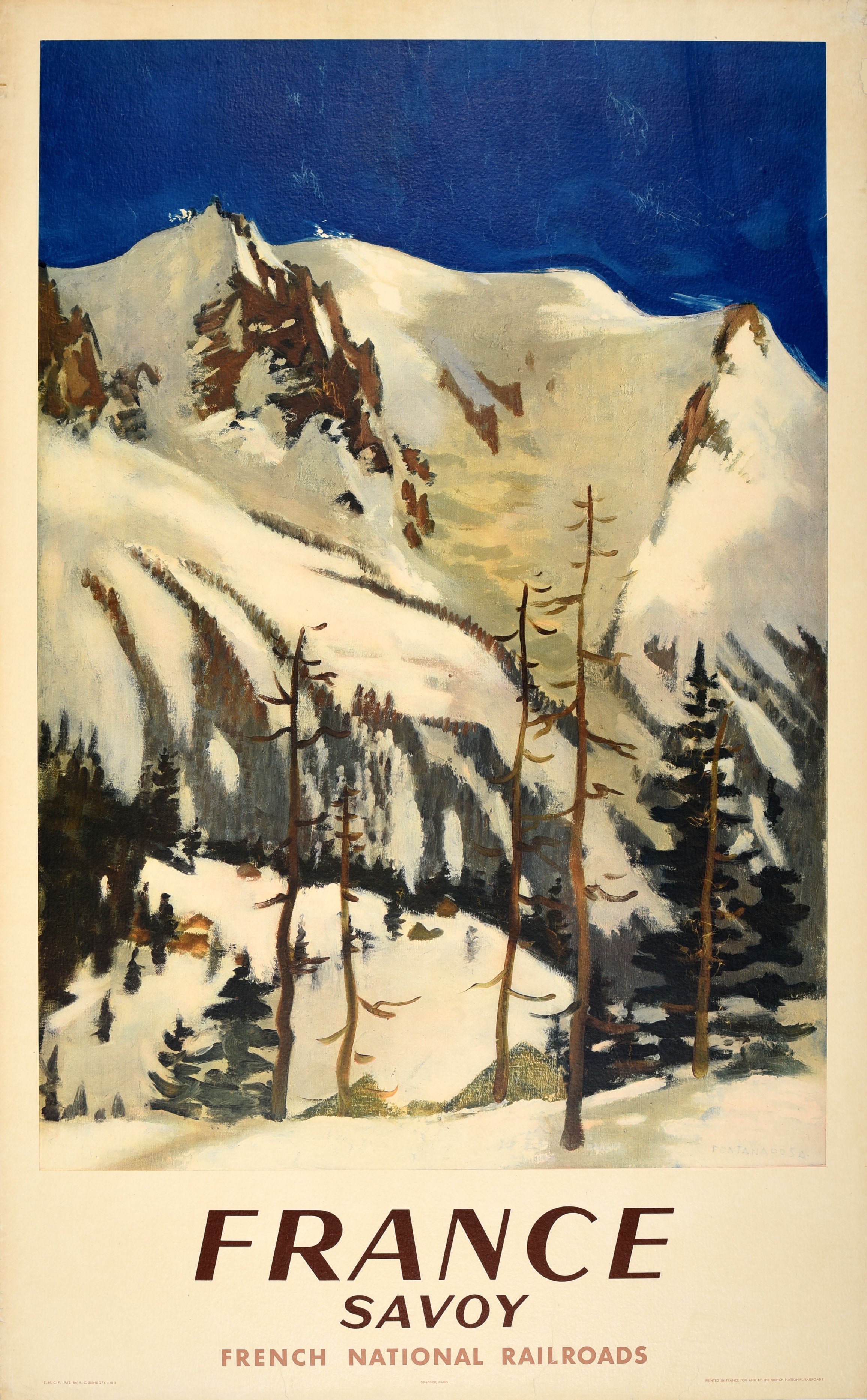 Original vintage winter travel poster advertising France Savoy French National Railroads featuring scenic artwork by the French painter Lucien Fontanarosa (1912-1975) of a snow covered mountains with trees in the foreground and a dark blue sky above, the text on the margin below. The Alpine region of Savoie and Haute-Savoie in south east France is known for its mountain ranges including the Mont Blanc massif. Printed by Draeger, Paris. Good condition, restored tears, restored paper losses, restored crease marks, staining, backed on linen.