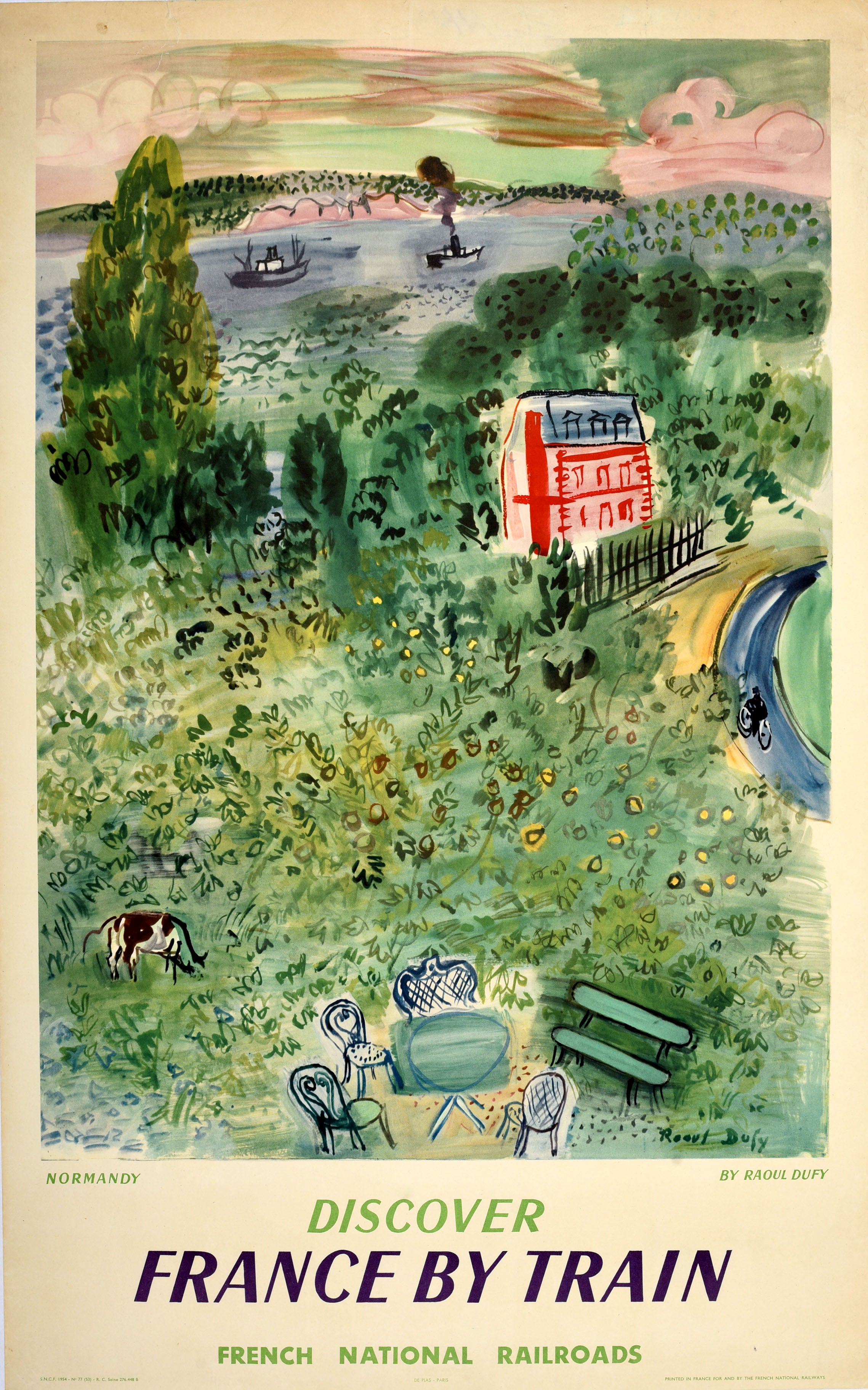 Original vintage railway travel poster advertising Normandy Discover France by Train French National Railroads featuring artwork by the French artist Raoul Dufy (1877-1953) depicting a scenic view showing a cow in the countryside with a picnic table and chairs by a bench, a person cycling towards a red house with trees in front of boats on the water and cliffs in the distance. Issued for the state-owned French National Railways (SNCF Societe Nationale des Chemins de Fer Francais; founded 1938). Good condition, restored tears, staining, backed on linen.