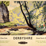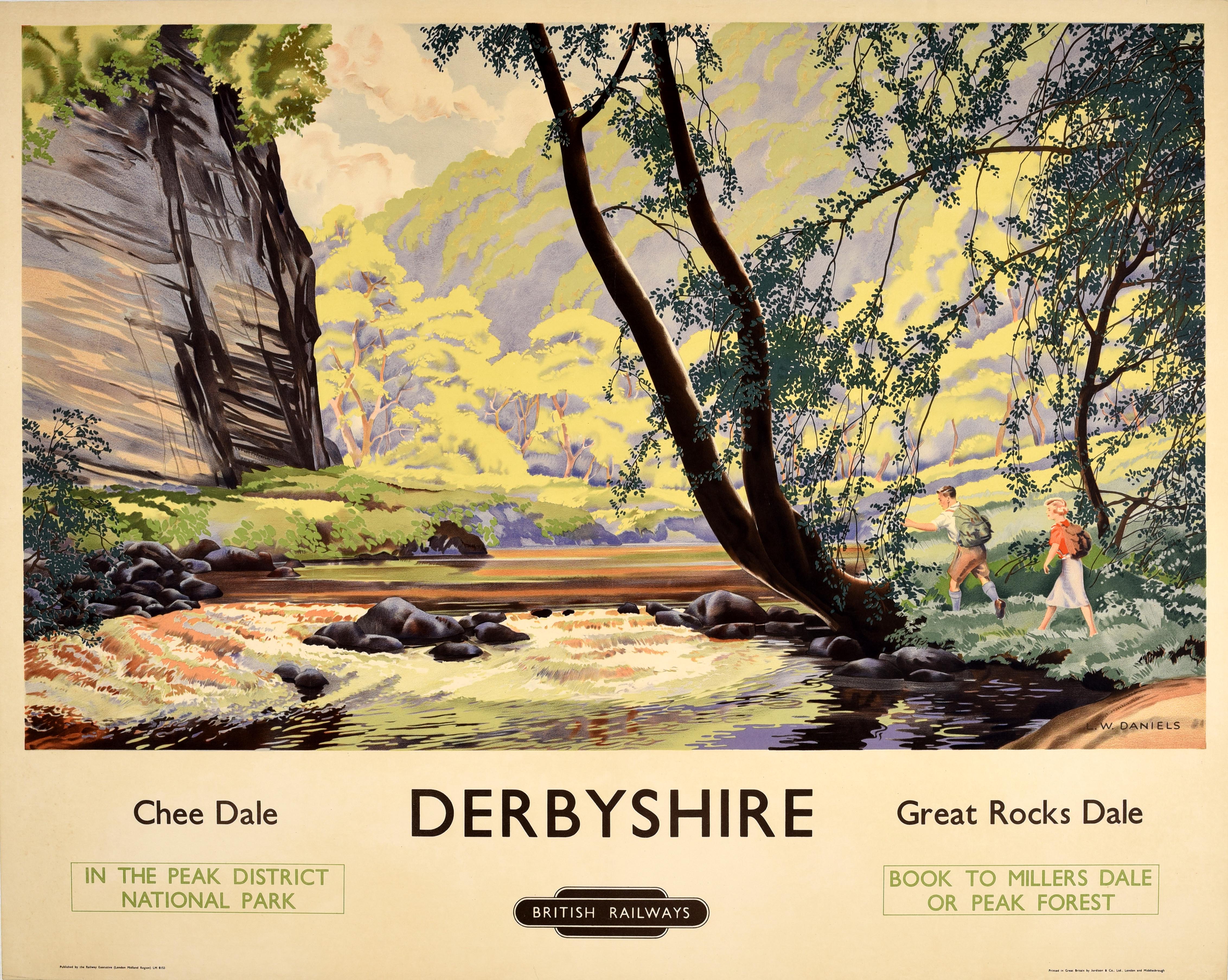 Original vintage British Railways train travel poster - Derbyshire Chee Dale Great Rocks Dale in the Peak District National Park Book to Millers Dale or Peak Forest - featuring stunning artwork depicting a peaceful countryside view of the River Wye flowing towards the hills in the distance, passing tall rock cliffs on the left with a couple walking on the grass below the trees arching over the water on the right, the bold title text and logo on the margin below. Published by the Railway Executive (London Midland Region). Printed in Great Britain by Jordison & Co., Ltd., London and Middlesbrough. Horizontal. Good condition, restored creasing, repaired tears, staining, backed on linen.