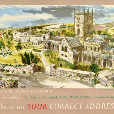Original vintage post office advertising poster featuring a great artwork depicting St. David's Cathedral building, the caption below the image reads - Correct Address: St. David's Cathedral, Haverfordwest, Pembrokeshire. Please use your correct address. GPO - General Post Office poster. Horizontal. Very good condition, creasing, small tears.