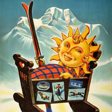Original vintage winter sport ski travel poster for St Moritz featuring a great design by Hugo Laubi (1888-1959) depicting the St Moritz smiling sun logo as a baby with curly hair lying in a wooden cradle and holding a pair of skis with the snowy mountains of the Swiss Alps in the background, the cot is decorated with a carved heart shape and the year 1867 at the end, and pictures of a lady skiing and a curling stone, a man on a skeleton bobsleigh sled and a race horse on the side, the title in white on the blue sky above. Printed in Zurich by JC Muller. Good condition, restored tears, staining, backed on linen.