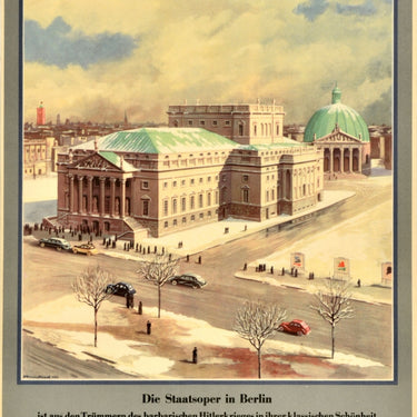 Original vintage propaganda poster issued by East Germany (Deutsche Demokratische Republik DDR / German Democratic Republic GDR) under the title Bauten des Funfjahrplanes / Buildings of the Five Year Plan featuring a view of the historic Staatsoper Berlin State Opera (built 1741-1743), showing people walking along the Unter den Linden boulevard with a few cars on the road and light snow on the rooftops and trees, the text below in German - The State Opera in Berlin emerged from the rubble of Hitler's barbaric war in its classic beauty thanks to the cultural policy of our workers' and peasants' power. In the future it will no longer serve the amusement of rich idlers, but rather the recreation and edification of the working people through creations from our national cultural heritage and operas by domestic and foreign masters. Good condition, minor creasing, minor staining, small tears.