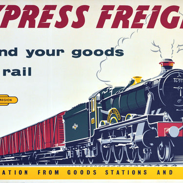 [ON RESERVE 21/3/17] Original vintage silkscreen poster issued by British Railways, Western Region to promote their Express Freight service - Send your goods by rail - Information from goods stations and depots. Fantastic image by the prolific railway poster artist, A N Wolstenholme, of a steam locomotive pulling the freight cars. Judging by the shape it appears to be 6959 Class or Modified Hall Class developed by Frederick Hawksworth on the basis of Charles Collett's earlier Hall Class. Horizontal. Bright colours. Good condition, repaired cracks and minor losses, tear on the right side of the poster, backed on linen.