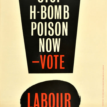 Original vintage political 1959 General Election poster issued by the Labour Party against the hydrogen bomb featuring a dynamic typography design with the bold white and red letters inside a black exclamation mark - Stop H-Bomb Poison Now Vote Labour. Printed by Weddell Bros Ltd. Good condition, creasing, folds, tears.