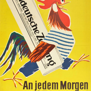 Original vintage advertising poster for Suddeutsche Zeitung / the South German newspaper featuring fun and colourful design depicting a smiling cockerel in a striped shirt and blue trousers walking with a newspaper under its wing on a yellow background, the caption in black reading - An jedem Morgen SZ besorgen! / Get SZ every morning! Founded in Munich in 1945 the Suddeutsche Zeitung (SZ) was the first newspaper licensed by the US military administration after the end of World War Two; it is one of the largest newspapers in Germany and covers topics on politics, culture, the economy and sport. Large size. Good condition, folds, staining, creasing, repaired tears, tears.