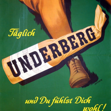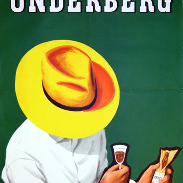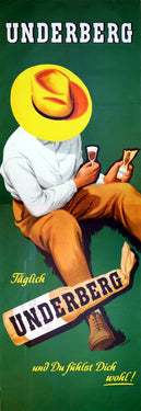 Original vintage poster advertising Underberg, Austria. 1950s design by Berretz featuring a man drinking Underberg with the slogan, "Taglich Underberg und Du fuhlst Dich wohl!" (Daily Underberg makes you feel good!). Two parts. Good condition, fold lines, light bumps on margins. Sizes: top part 86x59cm, bottom part 84x59cm.