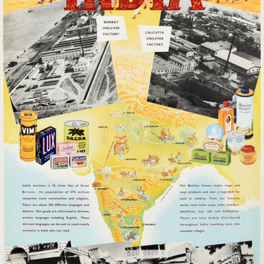 Original vintage advertising poster for Unilever Overseas India. Great illustrated map of India showing the industry production for Unilever with images including a tiger in a jungle, the Taj Mahal and Gateway to India monuments, farming and tea picking, and various cities marked with text showing distances of the area - Delhi to Calcutta over 800 miles Calcutta to Madras over 850 miles Madras to Bombay (now Mumbai) over 600 miles Bombay to Delhi over 700 miles. The product shown on the side include Vim, Lux, Lifebuoy soap, Dalda, Sunlight, Rexona, Pears soap, Himalaya Bouquet talcum powder and Gibbs, with black and white photographs above showing the Bombay Unilever Factory and Calcutta Unilever Factory and diagonal photos below with captions - Sunlight and Lifebuoy being unloaded from the usual Indian handcart; Our products are sold in bazaar streets like this; Delivery of the Dalda brand of vegetable fat to dealers by ox cart; Street scene in Calcutta. The design is set on a pale yellow and pale blue sea background with people in different traditional dress walking behind the title in bold stylised lettering above, the information text on India and its people, communities, languages and population, and the company's production and distribution network in the country below. The British company Lever Brothers was founded by William Hesketh Lever 1st Viscount Leverhulme (1851-1925) and James Darcy Lever (1854-1916) in 1885 (based in north west England); in 1895 they expanded into the American market (based in Cambridge, Massachusetts); in 1929 the company was renamed Unilever after merging with the Dutch company Margarine Unie (founded 1927) to become the first modern multinational company. Unilever is now based in London England operating worldwide. Good condition, restored paper losses, restored tears, staining, backed on linen.