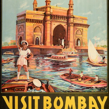 Original vintage travel poster - Visit Bombay for Pleasure or Business - featuring boats sailing at sea on the busy waterfront with the Gateway of India monument in the background, a man in a sailor uniform and sunglasses waving to the viewer whilst standing on the bow of a speedboat in the foreground, a family fishing on a rowing boat and a man hoisting a sail on a traditional dhow sailing boat, set within a yellow line frame with a scroll and the State Emblem of India above and the bold yellow lettering on the brown margin below. Opened in 1924 the ceremonial Gateway of India arch monument in Mumbai (Bombay) was built to commemorate the coronation of George V as Emperor of India in 1911; the triumphal arch is styled on Indo-Islamic 16th century Gujarati architecture designed by the Scottish architect George Wittet (1878-1926), the first President of The Indian Institute of Architects (established 1917). Issued by the Directorate of Publicity, Bombay. Artist signature printed in bottom right of image. Good condition, restored punched holes on bottom edge, restored tears, restored creasing, some discolouration, backed on linen.