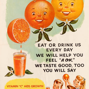 Original vintage American food and drink advertising poster published by the School Services Department and the Florida Citrus Commission to encourage children to eat more citrus fruits: We Help You Keep Fit! Eat or drink us every day We will help you feel "A OK" We taste good too you will say Vitamin "C" aids growth of strong bones, teeth and healthy gums. Fun design featuring colourful illustrations of an orange and a grapefruit with human features smiling above a group of happy and healthy children holding fruit and freshly squeezed juice below, the text across images in stylised black and red letters. Litho. in U.S.A. by Florida Press, Orlando. Good condition, folded as issued, staining in top margin, creases.