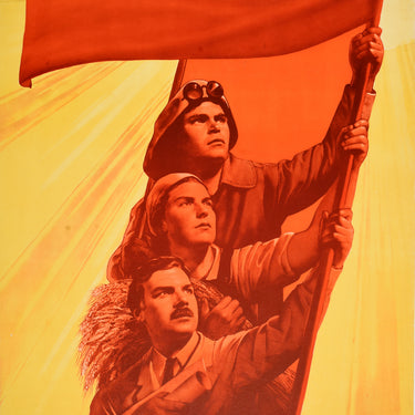 Original vintage USSR propaganda poster by the notable Soviet political poster designer Viktor Koretsky (1909-1998): We will complete the seven year plan! / Семилетку Выполним! Dynamic artwork featuring an engineer in a suit and an agricultural worker carrying a sheaf of wheat with an industrial factory worker at the top, all holding a red flag flying to side to create the number 7 on a dramatic yellow sun beam background with the bold lettering below. Good condition, restored tears, minor creasing, minor staining, backed on linen.