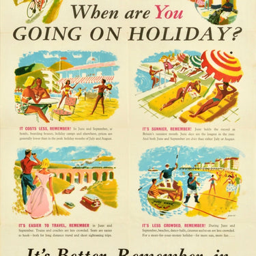 Original vintage travel poster promoting Holidays in Britain When are You going on holiday? It's Better, Remember, in June or September featuring colourful illustrations showing people enjoying a drink and playing games at a hotel resort, sunbathing on loungers and swimming in a pool, sightseeing and walking in the countryside watching a train passing over an old viaduct bridge, and going on a boat tour at sea next to a sandy beach with a pier in the distance, each with good reasons to travel under the captions - It costs less remember! It's sunnier remember! It's easier to travel remember! It's less crowded remember! Published by the British Travel and Holidays Association. Printed by Fosh & Cross Ltd., London. Good condition, folds, creasing, staining.