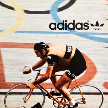 Original vintage advertising poster for Adidas shoes featuring a dynamic photograph of the professional road and track cyclist Eddy Merckx racing at speed in an indoor cycling event with the Olympic rings on the track in the background by the Adidas logo and an image of a pair of black sports shoes with the iconic Adidas three white stripes on them below, the black text above reading One hour time record with Adidas...Eddy Merckx... in French, German and English. One of the most successful competitive cyclists of all time, Eddy Merckx (Edouard Louis Joseph, Baron Merckx; b. 1945) achieved 525 victories including 11 Grand Tours and three World Championships as well as the hour record and all five Monuments (one day race events); after retiring from professional sport he established a bicycle chain and coached the Belgian national cycling team. Excellent condition.