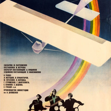 Original vintage Soviet film poster Adventures On Land And In The Sky - Земные и Небесные Приключения featuring a colourful design of a white plane with a red star on its tail flying down in front of a rainbow from the stylised blue title text with three motorcyclists on their bikes below, the credit text in black letters on the side. Good condition, foldы, minor tears and creases on margins.