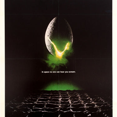 Original vintage sci-fi movie poster for the cult science-fiction horror film Alien directed by Ridley Scott and starring Tom Skerritt, Sigourney Weaver, Veronica Cartwright, Harry Dean Stanton, Ian Holm, John Hurt and Yaphet Kotto. Classic design featuring an image of an alien egg about to hatch with a bright neon light and smoke coming out of the cracks and the now-famous tagline below - In space no one can hear you scream - with the film title above and the rest of the credits below. Litho in U.S.A. Good condition, restored folds, repaired tears, backed on linen.