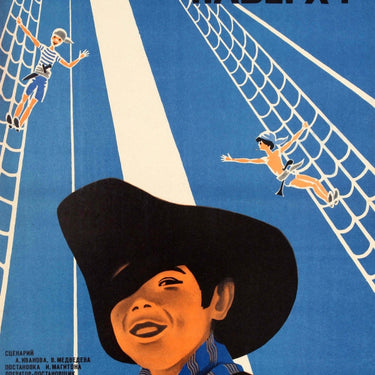 Original vintage Soviet movie poster for a family film Свистать всех наверх! / All hands on deck! directed by Isaak Magiton and starring Alyosha Saparev, Sasha Pavelko, Vitaly Chizhikov and Sasha Yasenev. Colourful artwork showing a smiling young boy dressed as a pirate in the foreground, ready for an adventurous expedition as two young crew members climb the ropes to set sail against a blue background with the title next to the mast above in black letters. Very good condition, faint creases in left margins.