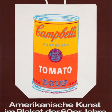 Original vintage advertising poster in German for the American Art in Posters of the 1960s exhibition held in Hamburg from 15 January to 30 March 1979 featuring a bright and colourful Pop Art image by the notable American artist Andy Warhol (1928-1987) of his famous Campbell's Tomato Soup Can in fluorescent orange, yellow and blue colours with Andy Warhol Institute of Contemporary Art Boston below, inside the shape of white shopping bag against a brown background, the text below in white letters. Printed by Hans Kahler, Hamburg. Very good condition, folded as issued, faint creases.