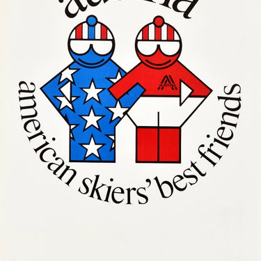 Original vintage winter sport poster for Austria American Skiers' Best Friends featuring a great design depicting two skiers with their arms interlinked, one figure in stars and stripes representing America and the other in red and white stripes as the Austrian flag against the white background, the text curved around the top and bottom of the image. Published by Austrian National Tourist Office, Vienna. Printed in Austria for the Austrian Federal Government by G. Gistel & Cie. Vienna. Very good condition, creasing on edges, small tears on edges.
