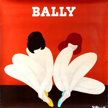 Original vintage advertising poster for Bally shoes featuring a fantastic illustration by the notable French graphic artist Bernard Villemot (1911-1989) showing a flower like shape in white of two elegant ladies looking down and sitting back to back with the attention drawn to the colour of their fashionable yellow and blue shoes, the Bally logo title above in white letters. Large size. Good condition, cracks and creases, small tears in margins.