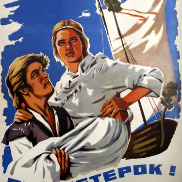 Original vintage Russian release movie poster for a Lativan film Вей, ветерок! (Blow, Wind / Put, vejini) based on a play by the Latvian poet Janis Rainis (1865-1929). Image of a man carrying a lady with wind blowing the sails on a ship in the background. Very good condition, light folds, tears.