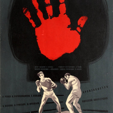 Original vintage Soviet film poster for a crime drama Ring written by Nikolai Leonov and starring Nikolay Grinko, Aleksandr Porokhovshchikov and Grigory Vartanov. Dynamic illustration depicting a bold red hand print inside a boxing glove above two men in a boxing ring against a dark grey background with the title text below and credit text along the lines of the ropes. Good condition, fold marks, restored tears, creases and stains on margins.