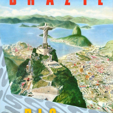 Original vintage travel poster for Rio de Janeiro in Brazil South America featuring the Christ the Redeemer statue on top of Mount Corcovado overlooking the city below with Sugarloaf Mountain and the sea leading to mist covered hills on the horizon, the Copacabana Beach Portuguese pavement wave design down the side with the title text in bold red letters above and bold yellow below - Brazil Rio. Completed in 1931 this iconic statue of Jesus Christ (Cristo Redentor) is the largest Art Deco statue in the world. Opened in 1906 the Copacabana Boardwalk (Calcadao de Copacabana) design represents the waves at the meeting of the Tagus River and the Atlantic Ocean and is known as Mar Largo (Wide Sea). Published by the Brazilian Government Trade Bureau. Good condition, creasing, small tears, staining, foxing.