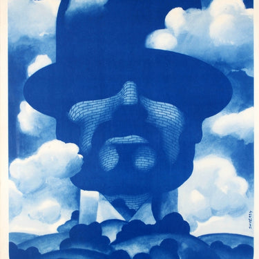 Original vintage Polish theatre poster for the play Budowniczy Solness / The Master Builder written by the notable Norwegian playwright and poet Henrik Johan Ibsen (1828-1906), performed at the Klasyczny Theatre in Warsaw in 1971. Fantastic design in shades of blue and white by one of Poland's most renowned poster artists and designers Waldemar Swierzy (1931-2013) depicting a large mysterious face of a man made out of bricks with his bowler hat emerging into a cloudy sky and his collar blending into the trees in the countryside landscape below, the text in black letters along the bottom. Very good condition, minor tears in left margin, creases.